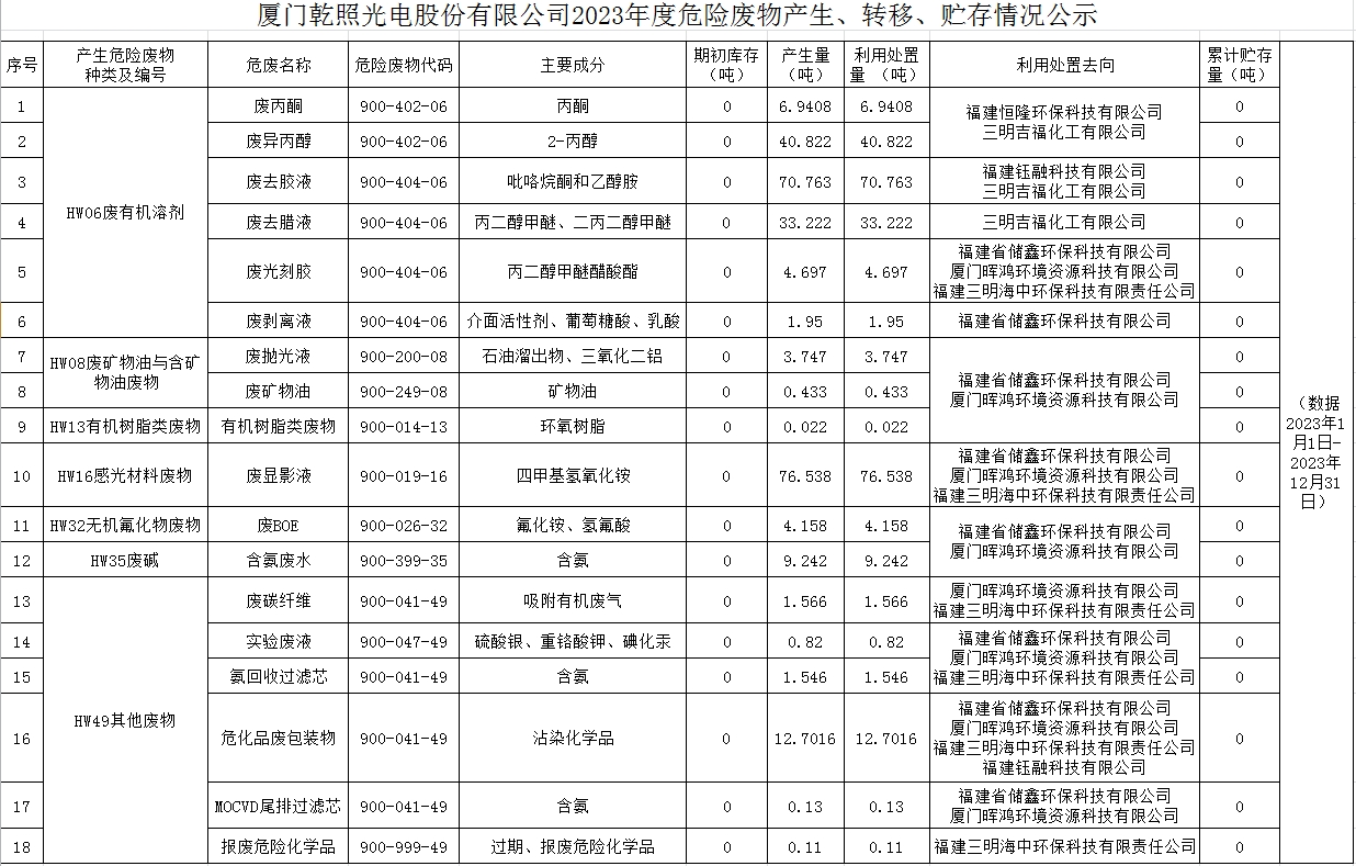 廈門(mén)乾照光電股份有限公司2023年度危險(xiǎn)廢物產(chǎn)生、轉(zhuǎn)移、貯存情況公示