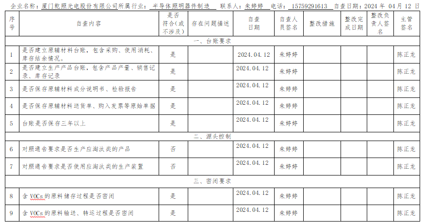廈門市揮發(fā)性有機物污染防治企業(yè)自查表(本企業(yè)對表格數(shù)據(jù)內(nèi)容負責) 企業(yè)名稱:廈門乾照光電股份有限公司所屬行業(yè):半導體照明器件制造 聯(lián)系人:朱婷婷 電話:15759291613自查日期:2024年04月12日 ...